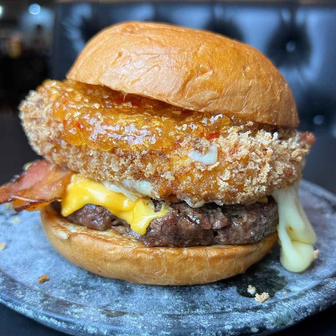 Burguer exclusivo com um suculento blend de 150g, 2 fatias de cheddar derretido, bacon crocante e mussarela empanada, tudo isso envolto em um pão de brioche macio e finalizado com a doçura picante da nossa exótica geleia de pimenta folheada a ouro.